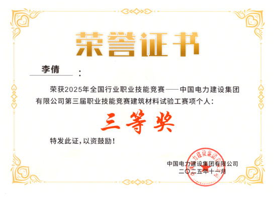 近日,2025年全国行业职业技能竞赛—中国电建第三届职业技能竞赛建筑材料试验工赛项在杭州圆满落幕。本次竞赛由中国电力建设集团有限公司与中国就业培训技术指导中心联合主办,共有来自公司28家子企业的84名选手参与角逐。贵阳院李倩、李松、李浩组队参赛,凭借扎实的专业知识和熟练的操作技能,经过“理论+实操”的综合考核,李倩最终脱颖而出,荣获个人三等奖的优异成绩。 本次竞赛紧扣电建业务发展需求,通过理论知识与实操技能双重考核,全面检验选手对专业知识的掌握深度和实际操作的精准程度,为技术技能人才搭建了展示风采、切磋技艺和交流提升的平台。 在为期三天的激烈角逐中,李倩在理论笔试和现场实操中表现优异,从28家单位的84名选手中脱颖而出。竞赛中,李倩沉着应战、精准实操,在试验流程中不断打磨精进,展现了精益求精的工匠精神,圆满完成各项考核。成绩的取得,体现了贵阳院职工扎实的专业功底和解决实际问题的能力。 近年来,贵阳院持续加强技能队伍建设,坚持以赛促学、以赛促训,通过岗位练兵、数字化实训、交流观摩及技能竞赛等方式,培养了一批高素质技能人才,营造了钻研技术、深练硬功的浓厚氛围。未来,贵阳院将持续搭建技能提升平台,进一步完善“训赛结合、以赛促训”的人才培养机制,鼓励员工以赛促学、岗位成才,为贵阳院高质量发展注入强劲人才动力。 | ||||